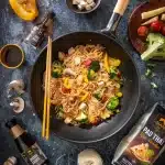 Wasser, Zucker, SOJAsauce (Wasser, SOJAbohnen, WEIZENmehl, Salz, Zucker), Verdickungsmittel: modifizierte Stärke, Salz, AUSTERN (7%), Farbstoff: Zuckerkulör