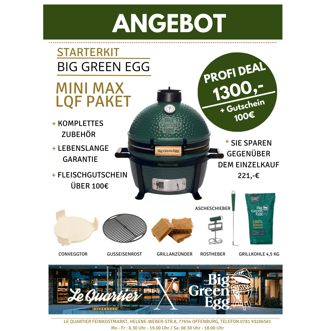 Warten Sie nicht, bis dieses unschlagbare Angebot vorbei ist. Sichern Sie sich Ihr Big Green Egg Large LQF Paket noch heute und bringen Sie Ihr Grillerlebnis auf die nächste Ebene!