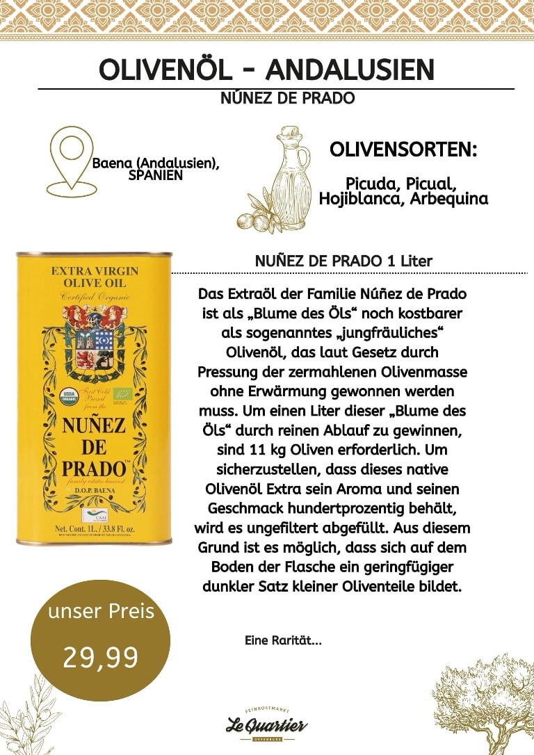 | Verfahren / Besonderheiten | „Flor de Aceite“ – sogenanntes Tropföl: Das Öl tropft ohne mechanische Pressung aus der zermahlenen Olivenmasse. Besonders schonende Gewinnung, ungefiltert abgefüllt. Für 1 Liter Tropföl sind rund 11 kg Oliven nötig. Am Flaschenboden kann sich naturbedingter Satz bilden. |