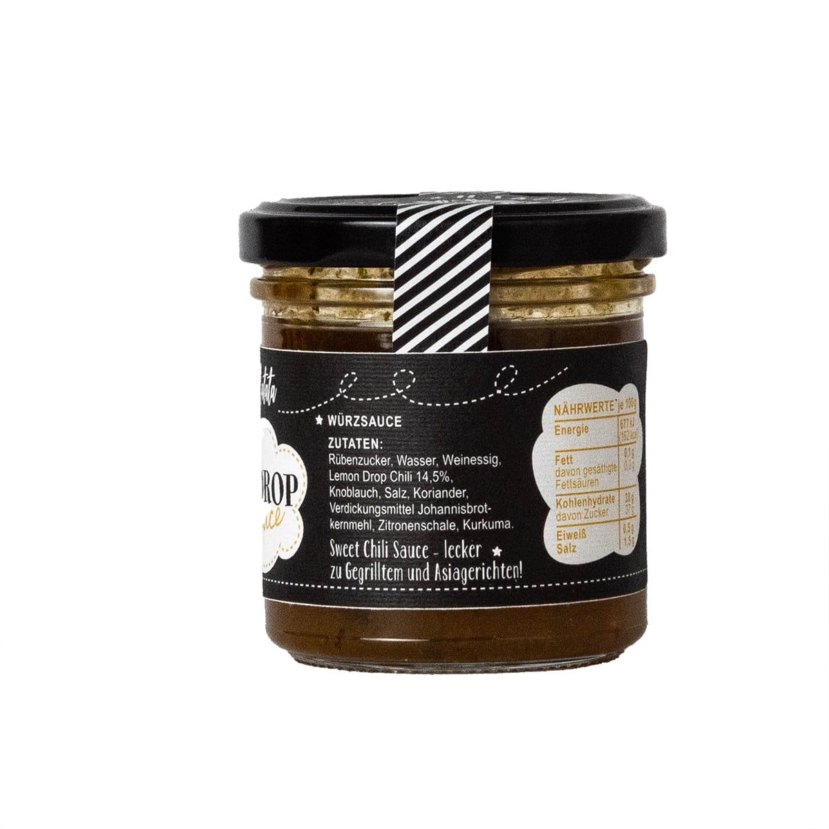Zutaten: Rübenzucker, Wasser, Weinessig, Lemon Drop Chili 14,5 %, Knoblauch, Salz, Koriander, Verdickungsmittel Johannisbrotkernmehl, Zitronenschale, Kurkuma.