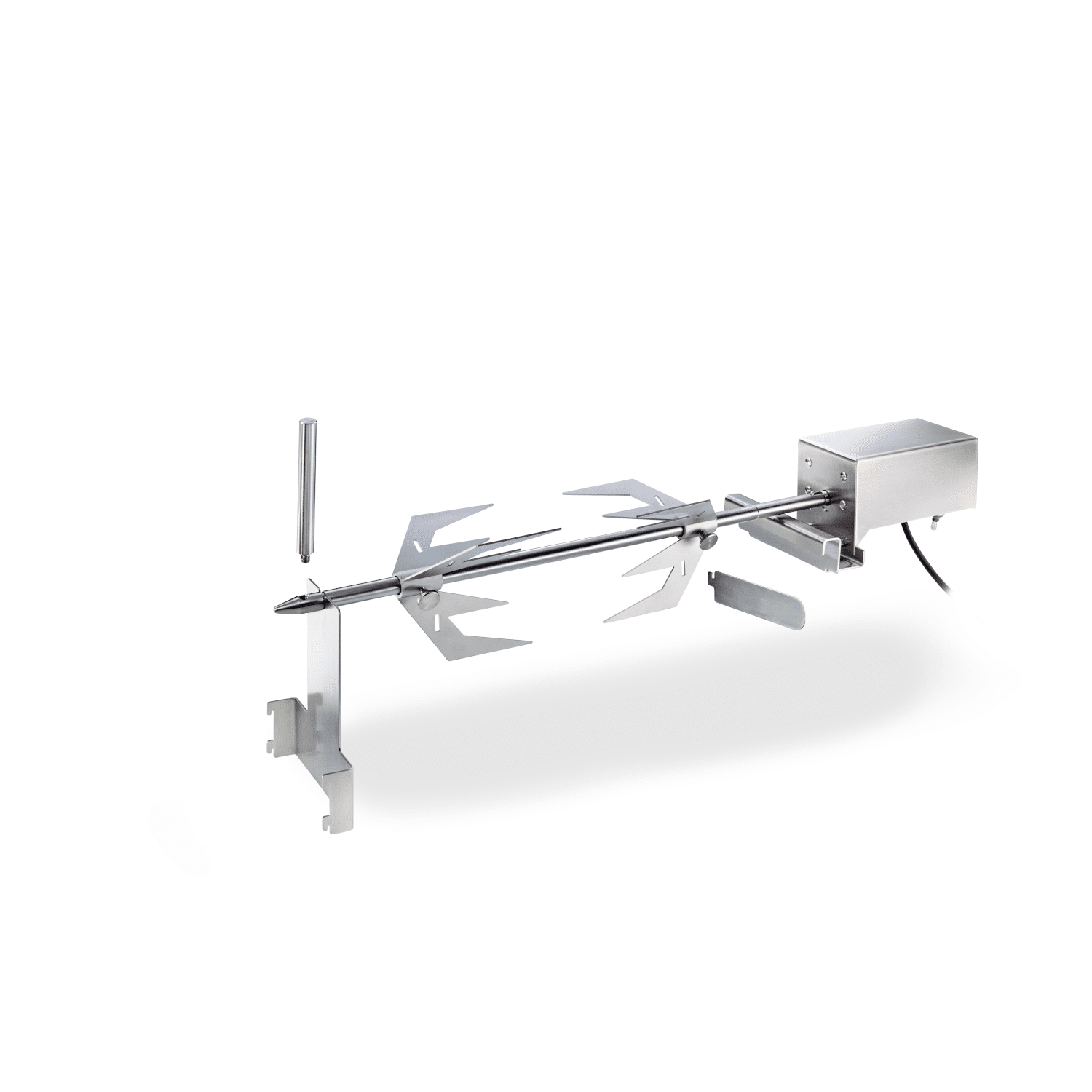 Komplett aus Edelstahl gearbeitet bietet der leistungsstarke Drehspieß Platz für bis zu 10 kg Grillgut.