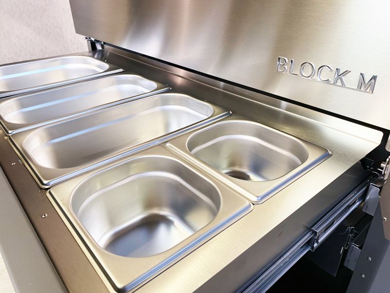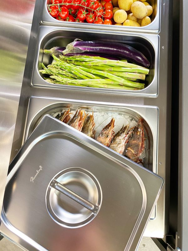 | Behälter | 5 extradicke Edelstahl‑Gastronorm‑Behälter inklusive Deckel (1 × ½, 2 × 1/3, 2 × 1/6) zur sauberen und flexiblen Lagerung. |